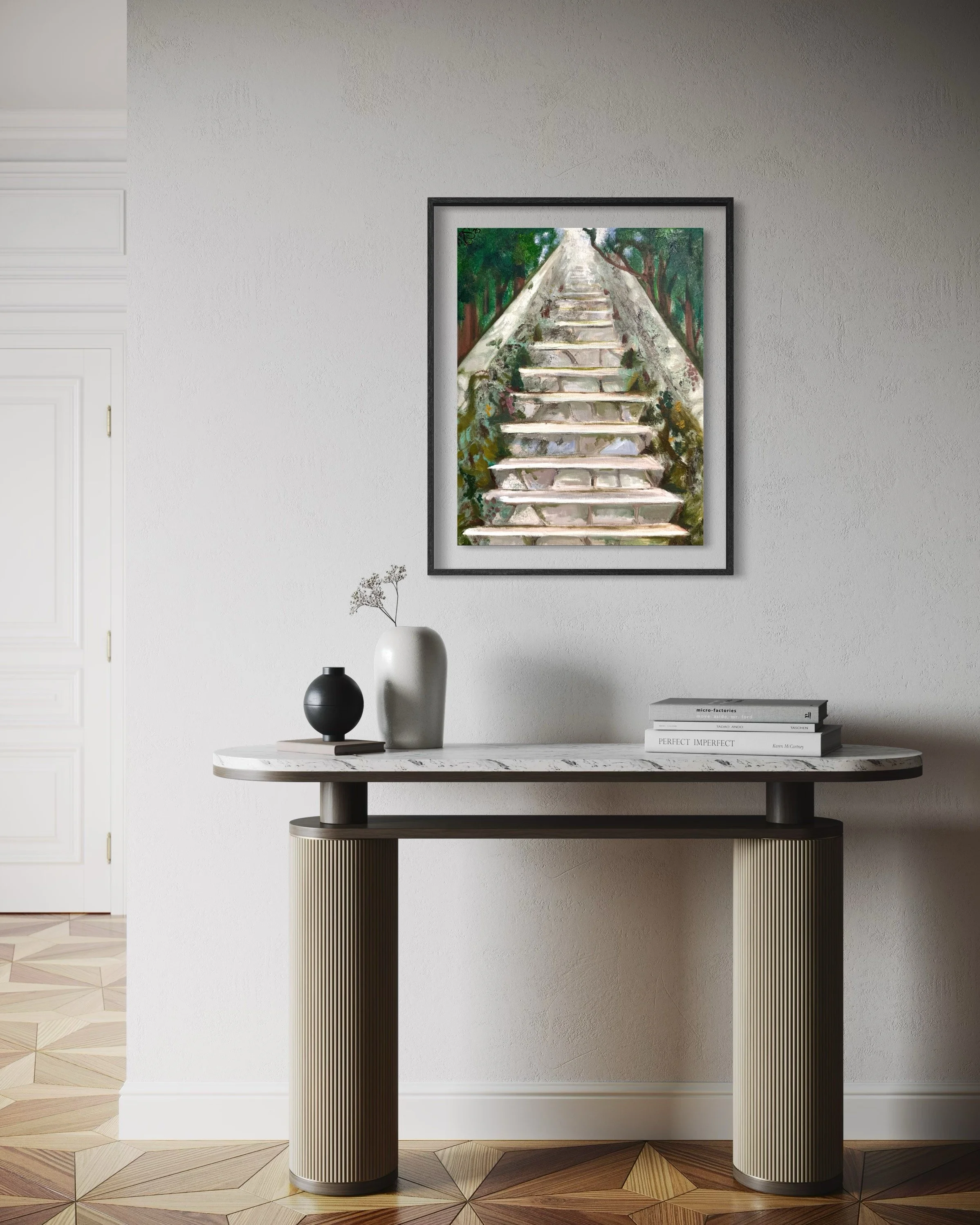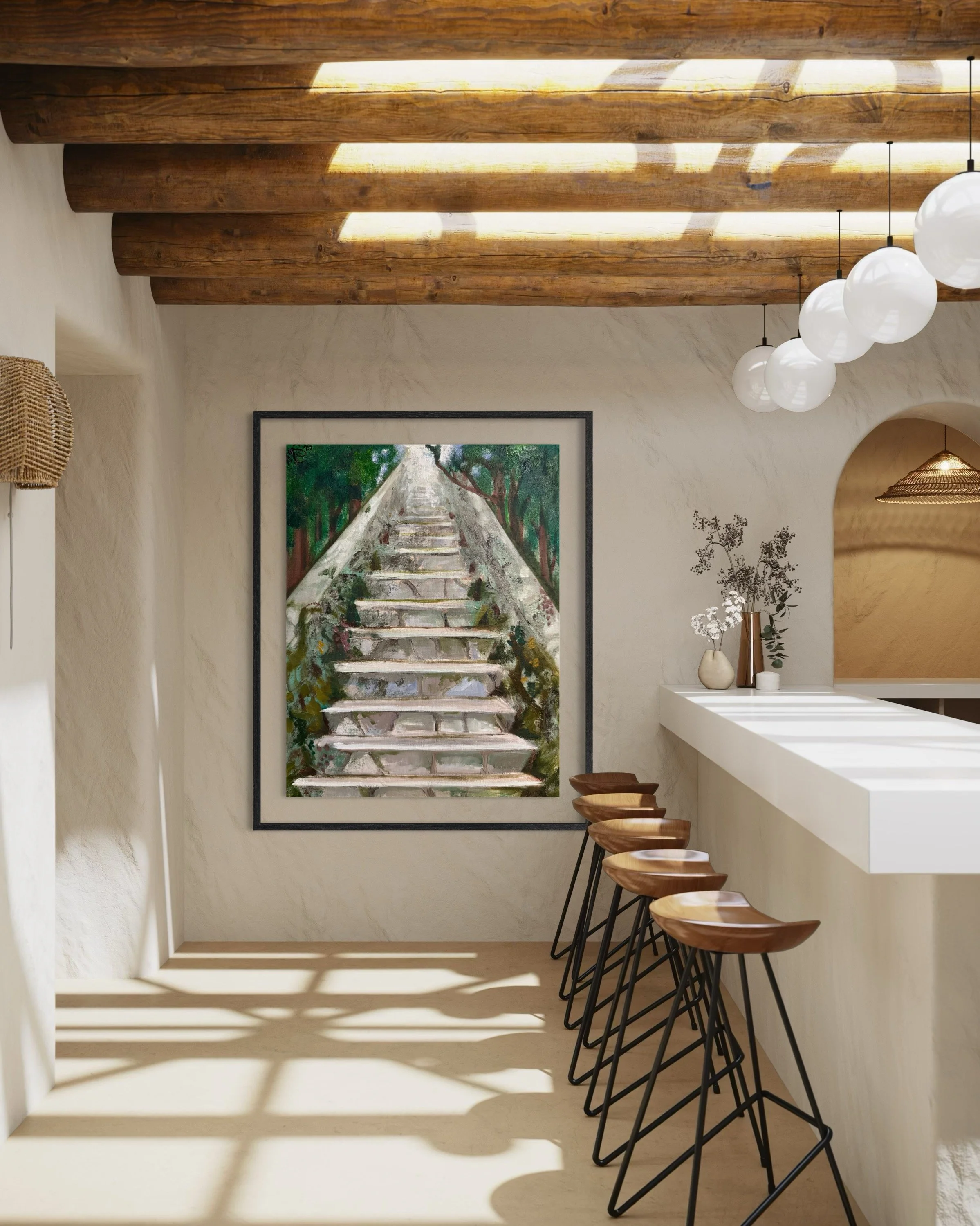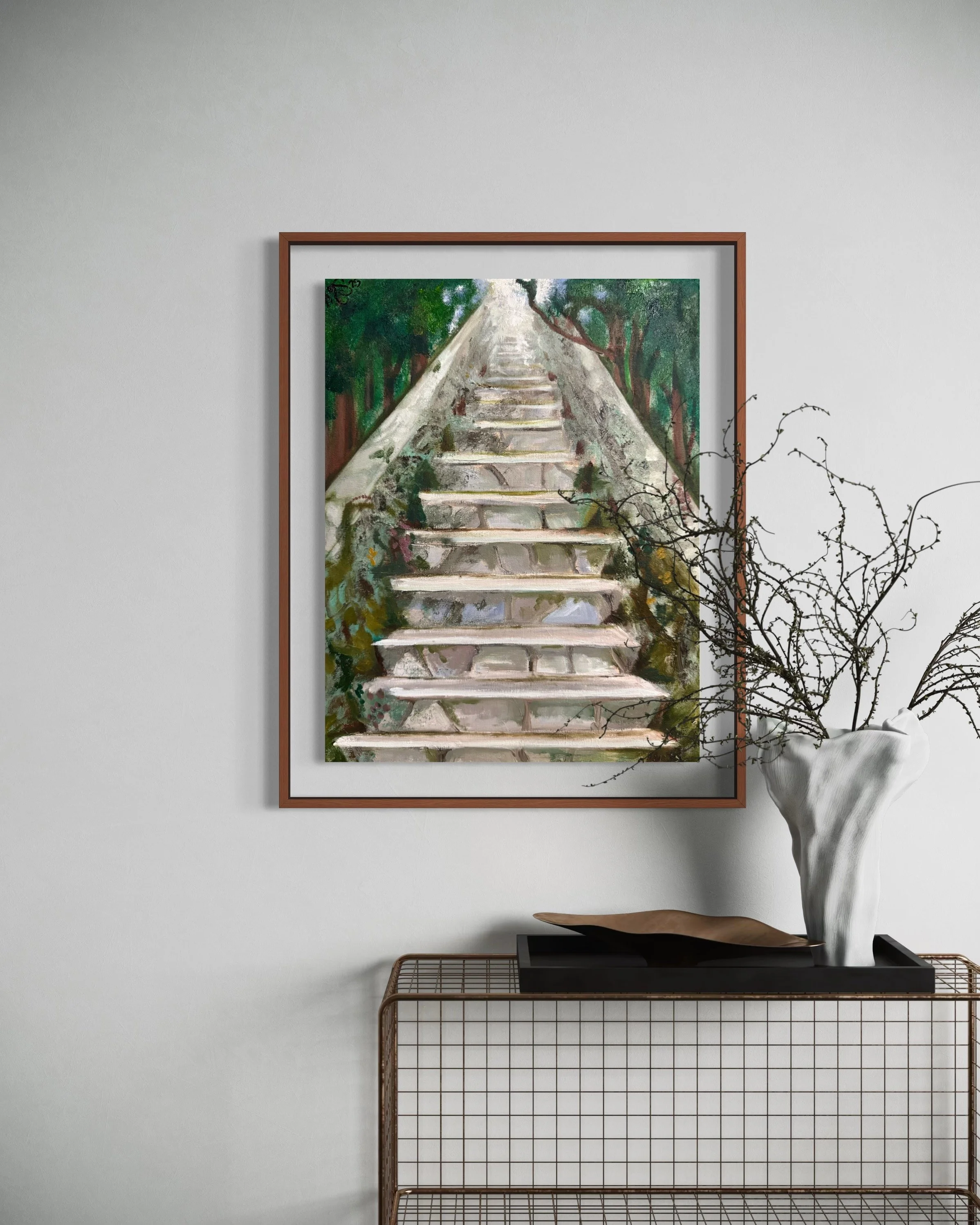 A stone staircase ascends through a lush, green forest, leading towards a bright and inviting light at the top. The greenery on either side suggests a serene and tranquil natural environment. Soft colors and gentle brushstrokes emphasize a sense of journey and introspection.